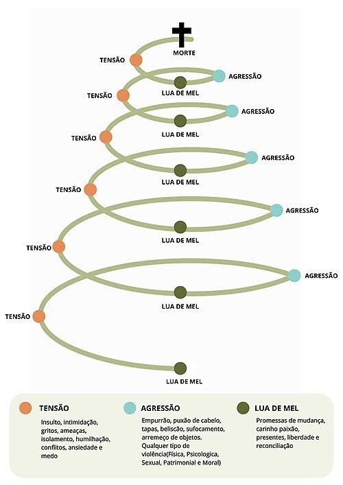 Na espiral da violência, temos as três fases assinaladas (lua de mel, agressão e tensão) , mas também dá para perceber com muito mais facilidade como, conforme o tempo entre as fases diminui, as violências se intensificam.