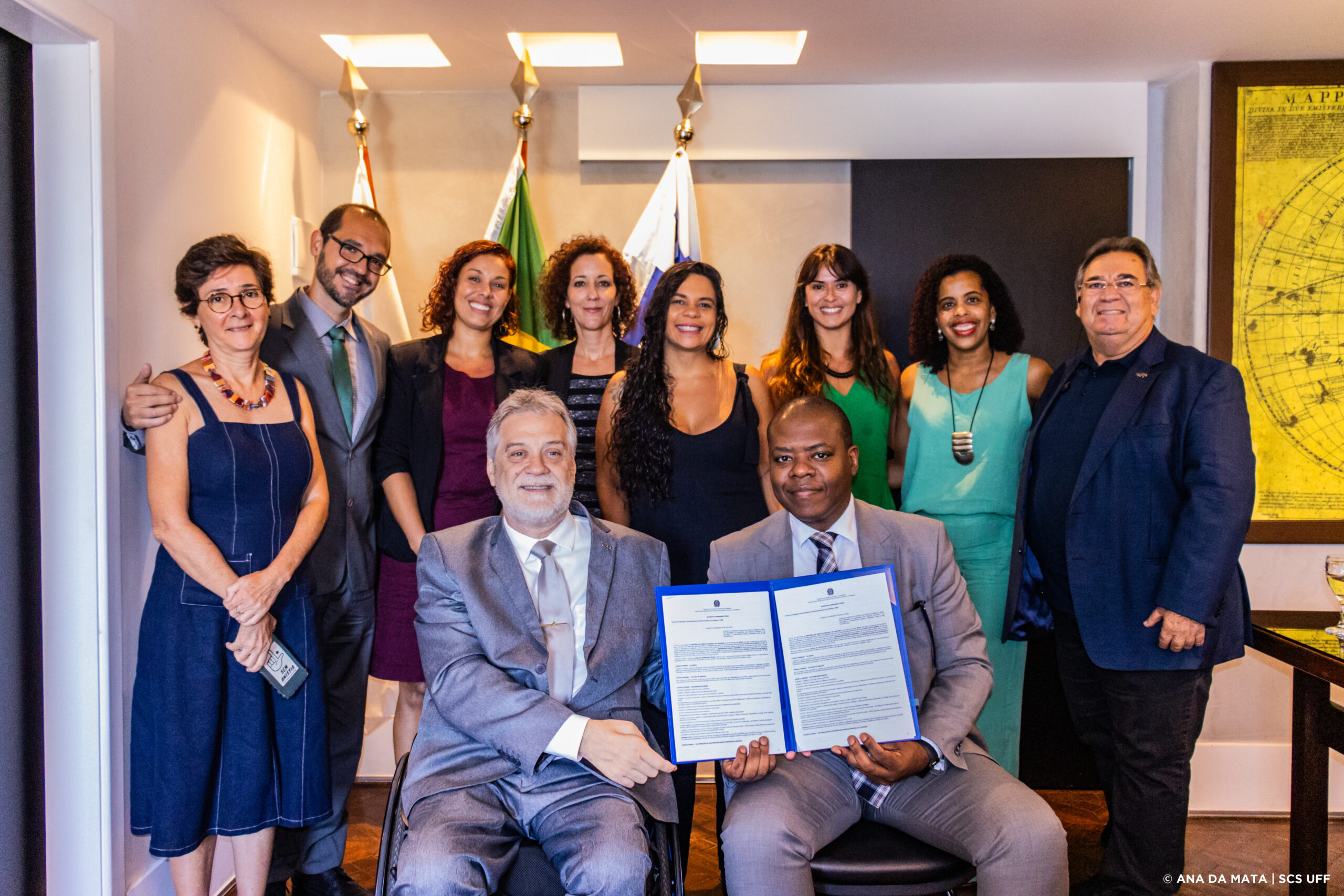 Identificação das pessoas na foto de destaque: – Esquerda para direita – Posicionados de pé, Laura Maciel, Chefe de Gabinete, Fernando Penna (UFF), coordenador do Projeto, Amanda Mendonça (FFP-UERJ), vice coordenadora do Projeto, Leticia Cesarino, Assessora Especial de Educação e Cultura em Direitos Humanos, Camila Barros Moraes, Chefe de Gabinete da Secretaria Municipal Direitos Humanos de Niteroi, Alessandra Siqueira Barreto, Pró-reitora de Assuntos Estudantis, Jaqueline Azevedo Brum, Secretaria de Acessibilidade da Pró-reitoria de assuntos estudantis e Mario Augusto Ronconi, Superintendênte de Operações e Manutenção. Sentados – da esquerda para direita – Reitor da UFF, professor Antonio Claudio Lucas da Nóbrega e Ministro dos Direitos Humanos e da Cidadaniada, Silvio Luiz de Almeida.