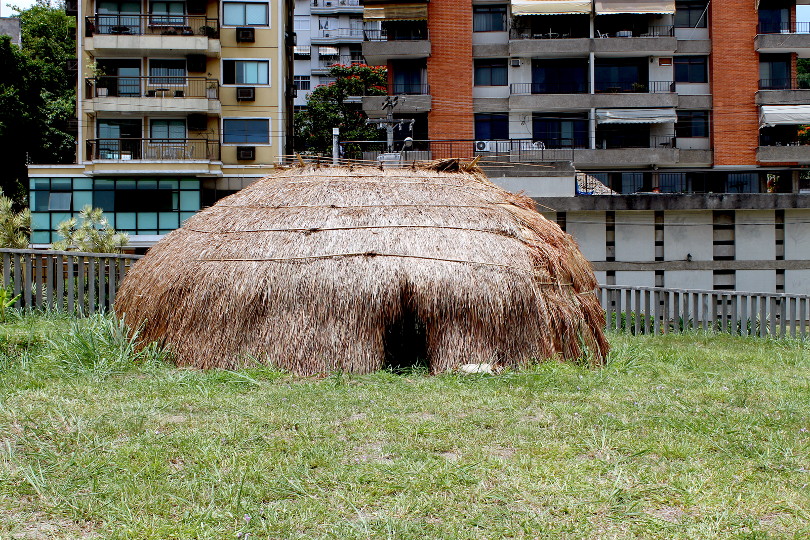 Dinah Guimaraens acrescenta que as ocas utilizaram duas técnicas construtivas distintas: a guarani tem uma estrutura de madeira de lei, eucalipto e caibros de madeira, com cobertura de sapê. Já a xinguana utiliza uma estrutura baixa de eucalipto, madeira de lei, um trançado de bambu e amarrações da estrutura feita com embira kamayurá e cobertura de sapê. “A maneira de colocar o sapê dos xinguanos é diferente dos guarani, pois eles dobram o sapê na estrutura de bambu e o tornam impermeável à chuva. É uma técnica milenar dos índios do Alto Xingu”, explicou.