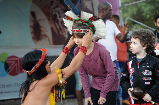 Foto destaque: Indígena realiza atividade com crianças durante o 69º encontro anual da SBPC (Reprodução/ Raíssa César/UFMG)