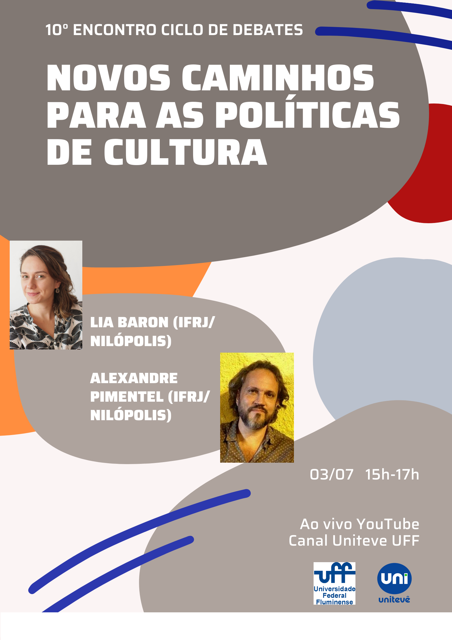 Neste 10º encontro a temática será em torno das políticas para o campo da cultura. Sob o título “Novos caminhos para as políticas públicas de cultura”. Os convidadxs são a professora Lia Baron (IFRJ) e o professor Alexandre Pimentel (IFRJ) que irão contribuir com suas perspectivas nesse debate.