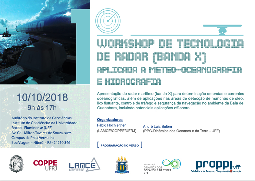 A UFF e a Coppe/UFRJ convidam para o 1º Workshop de Tecnologia de Radar (Banda X) Aplicada a Meteo-Oceanografia e Hidrografia, que acontecerá no dia 10 de outubro de 2018, das 9h às 17h, no auditório do Instituto de Geociências da UFF.