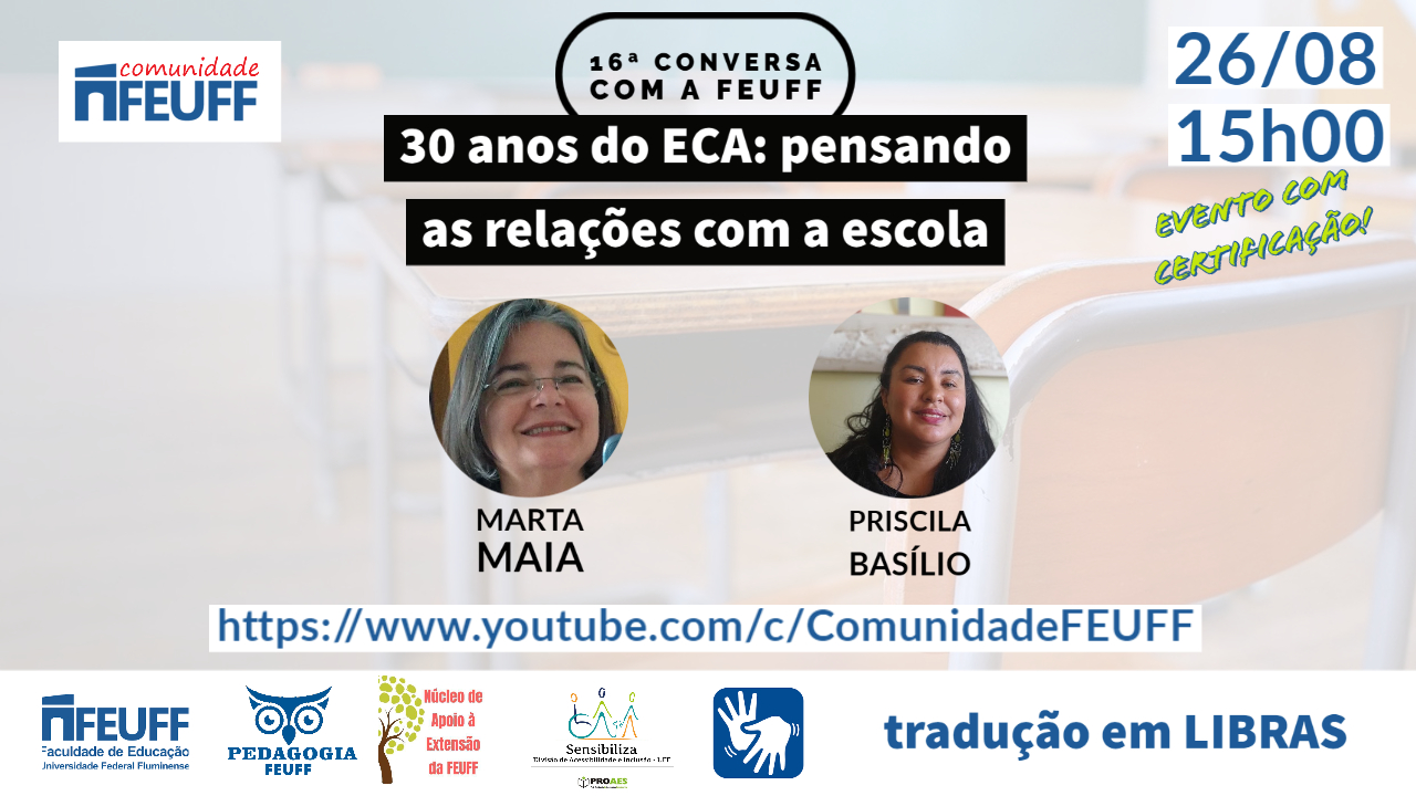 A nossa próxima Conversa com a FEUFF (26/08) terá como tema “30 anos do ECA: pensando as relações com a escola” e contará com a participação das professoras Marta Maia e Priscila Basílio.