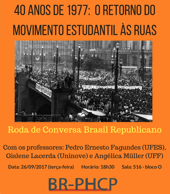40 anos de 1977: o retorno do movimento estudantil às ruas.Roda de conversa Brasil Republicano Com os professores: Pedro Ernesto Fagundes (UFES) Gislene Lacerda (Uninove) Angélica Muller (UFF) Debate