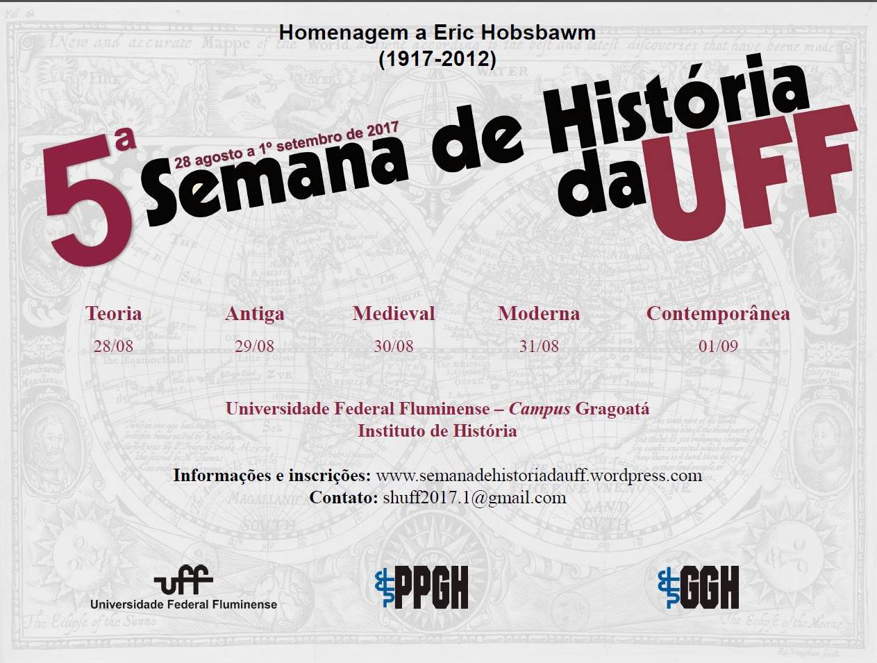 A Semana de História vem resgatar o debate como fator importante no desenvolvimento intelectual do historiador. O objetivo é debater publicamente temas importantes da historiografia produzida na UFF, bem como abrir um espaço privilegiado ao debate dos estudos e pesquisas que vêm sendo desenvolvidas pelos docentes, pós-graduandos e graduandos em História da Universidade Federal Fluminense e de outras instituições.