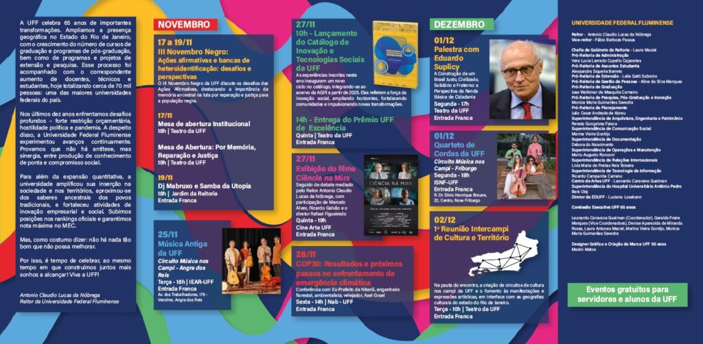 A um mês de completar 65 anos, a Universidade Federal Fluminense (UFF) segue em, novembro e dezembro, com uma série de eventos para comemorar a trajetória, a produção científica, a diversidade e o compromisso social da instituição. As atividades dão continuidade à aula magna ministrada pela escritora Conceição Evaristo, realizada em agosto, com grande adesão da comunidade acadêmica.