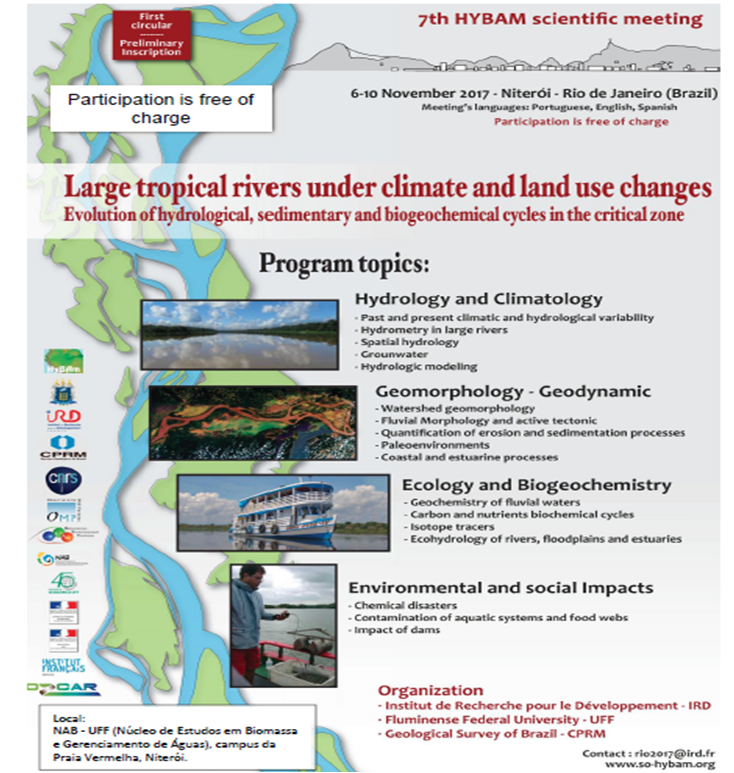 O Programa de Geoquímica da  Universidade  Federal Fluminense, Niterói – Rio de Janeiro, e o Institut de Recherche pour le Développement/IRD estão organizando o «7o emcontro científico do HYBAM “» com abertura no dia 6 de novembro de 2017 às 14h no Núcleo de Estudos em Biomassa e Gerenciamento de Águas, NAB – UFF, Campus da Praia Vermelha sob o título: “Large tropical rivers under climate and land use changes – Evolution of hydrological, sedimentary and biogeochemical cycles in the critical zone.”O evento será realizado no período de 06 a 10 de Novembro de 2017.