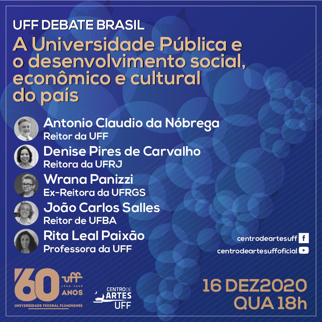 Em celebração aos 60 anos da UFF, o último UFF Debate Brasil de 2020 terá como tema A Universidade Pública e o desenvolvimento social, econômico e cultural do país.