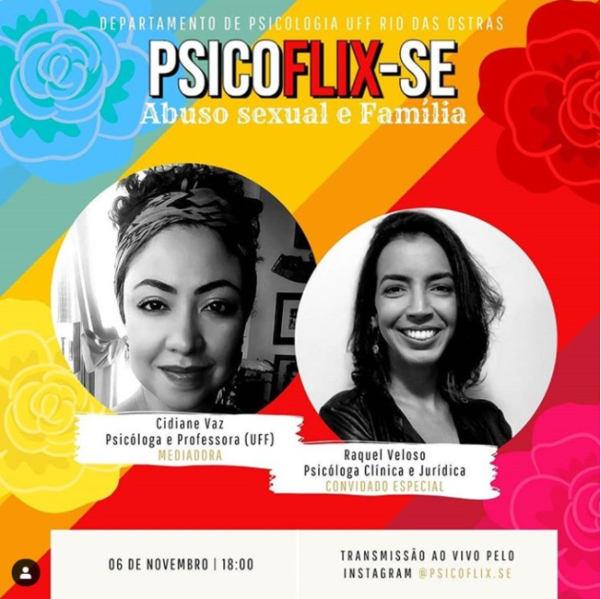 O projeto Psicoflix.se, nesta sexta-feira, dia 6 de novembro, terá como tema da live “Abuso Sexual e Família” e para abordar o assunto contaremos com a participação de Raquel Veloso graduada em Psicologia (PUC-Rio), especialização em Psicologia Clínico-Institucional, modalidade Residência Hospitalar (UERJ), especialização em Psicologia Jurídica (PUC-Rio) e atualmente está cursando Mestrado em Psicologia Clínica com ênfase em Saúde e Desenvolvimento (PUC-Rio). Membro do Grupo de Pesquisa APLab – Pessoas & Contextos (PUC-Rio), tem experiência na área de Psicologia, com ênfase em Psicologia Jurídica, Psicologia Clínica e Saúde Mental, atuando principalmente nos seguintes temas: abuso sexual, avaliação psicológica, psicanálise, violência, primeira infância, terapia familiar e Direito.