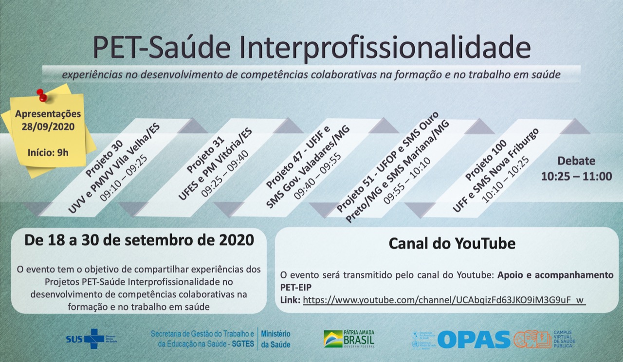 Em função da pandemia de COVID-19, a apresentação, com início previsto para às 10h10min, ocorre no formato on-line para todo o Brasil, pelo canal do YouTube Apoio e Acompanhamento PET-EIP (link https://www.youtube.com/channel/UCAbqizFd63JKO9iM3G9uF_w) . O encontro tem o objetivo de compartilhar, até o dia 30 deste mês, experiências dos projetos PET-Saúde Interprofissionalidade no desenvolvimento de competências colaborativas na formação e no trabalho em saúde. Após a apresentação dos alunos da UFF, todos participam de um amplo debate sobre o tema.