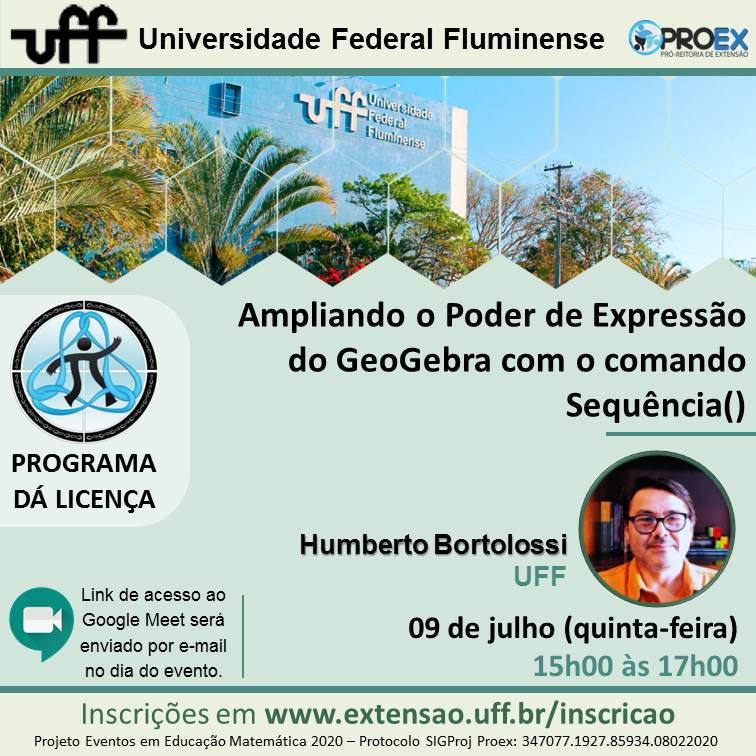 #ProexEmAção divulga que no dia 09/07 às 15h, o projeto de Eventos em Educação Matemática do Programa de extensão Dá Licença promoverá a oficina “Ampliando o Poder de Expressão do GeoGebra com o comando Sequência()”, que será ministrada pelo professor Humberto Bortolossi (UFF).