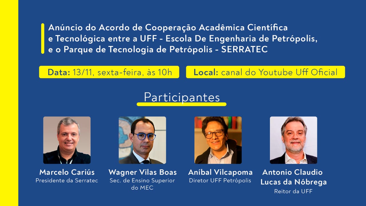 O presente acordo visa uma cooperação acadêmica, científica e tecnológica entre o Parque de Tecnologia de Petrópolis -Serratec (http://serratec.org/) e a Escola de Engenharia de Petrópolis(http://www.pep.uff.br/). O acordo de cooperação permite à UFF estar dentro das empresas, sediadas no Serratec, usufruindo da oportunidade de implementar as metodologias ativas de aprendizado, tal como o PBL (Project Basic Learning) com o propósito de se ter um curso mais prático e multidisciplinar, de acordo com o que propõem as novas Diretrizes Curriculares Nacionais (DCN). Cabe lembrar que estas metodologias ativas fazem parte do projeto pedagógico do curso.
