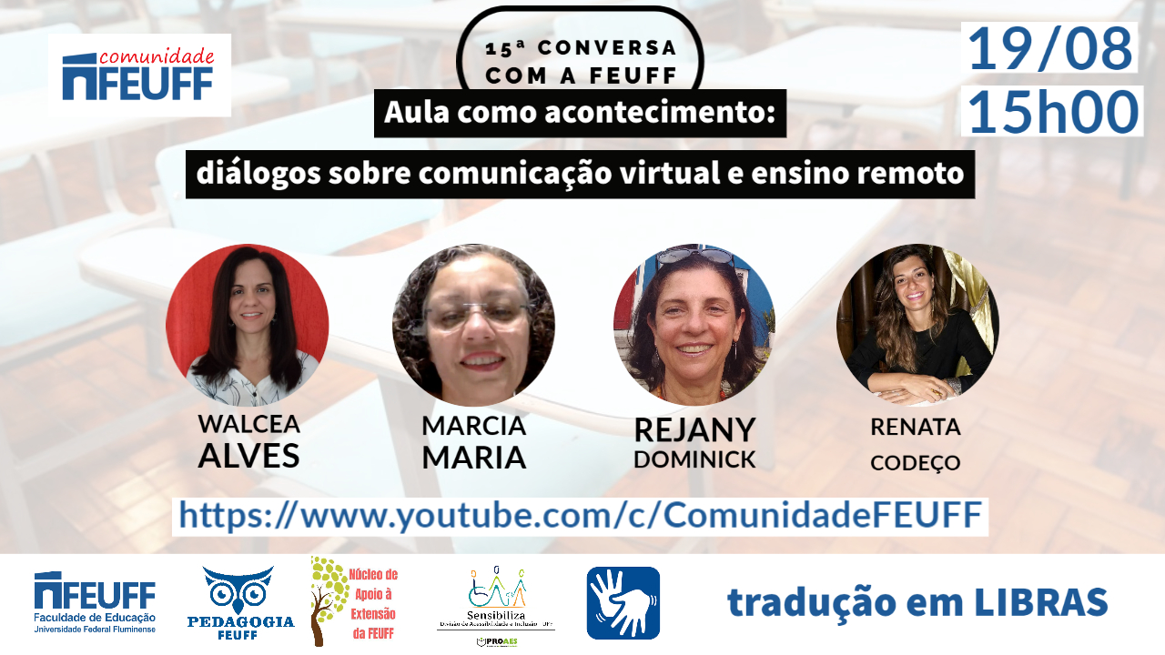 Nossa próxima Conversa com a FEUFF (19/08) terá como tema “Aula como acontecimento: diálogos sobre comunicação virtual e ensino remoto” e contará com a participação das professoras Walcéa Alves, Márcia Maria, Rejany Dominick e Renata Codeço.