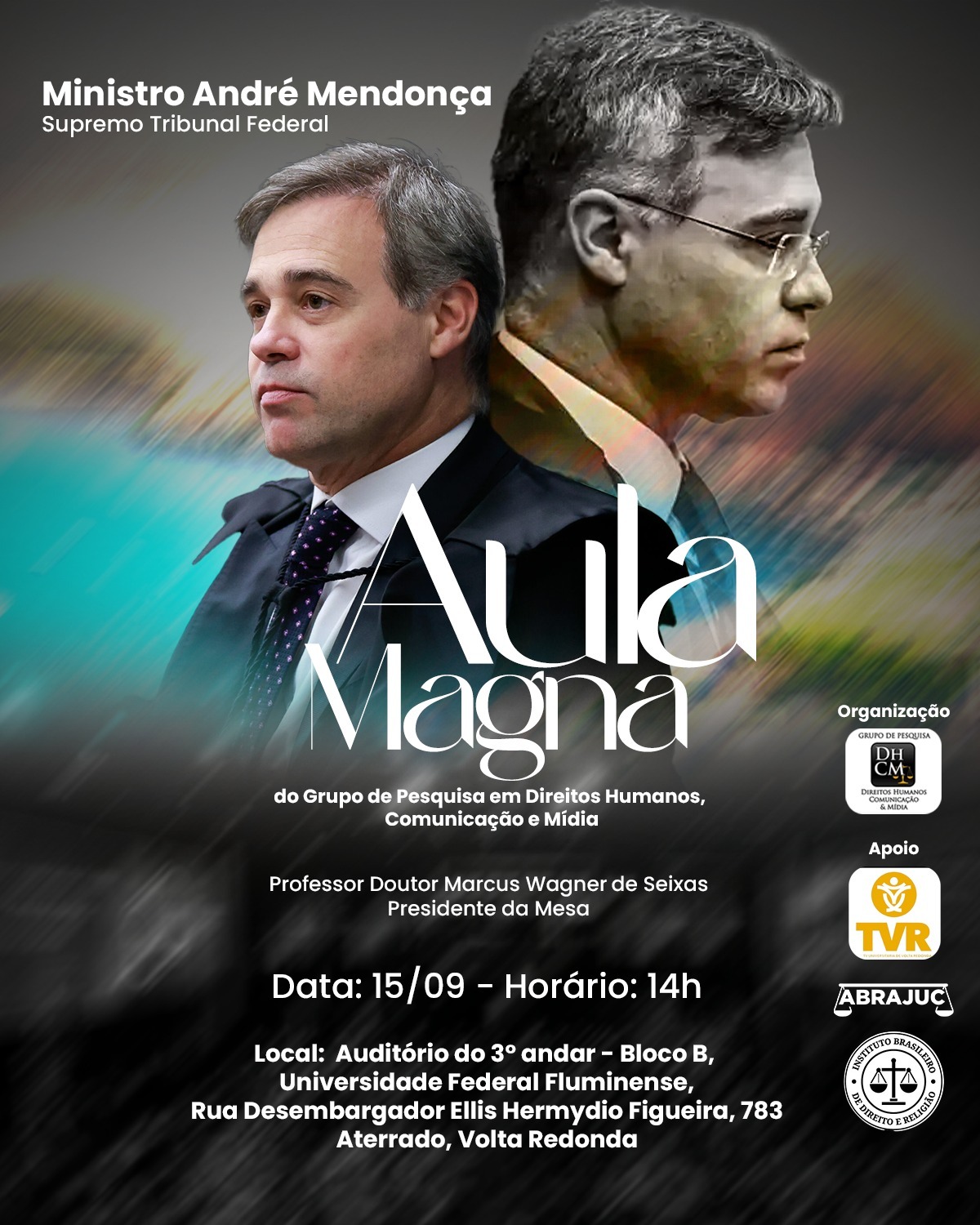 No dia 15 de setembro de 2025 às 14h ocorrerá no auditório da UFF em Volta Redonda, campus Aterrado, a Aula Magna do Exmo Ministro André Mendonça do STF, por ocasião do início dos trabalhos letivos 2025.2 do Grupo de Pesquisa em Direitos Humanos, Comunicação e Mídia (DHCMidia).