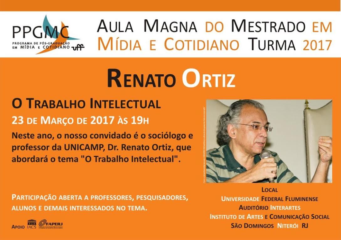 Aula Magna do Mestrado em Mídia e Cotidiano com o Prof. Renato OrtizAula Magna do Programa de Pós-Graduação em Mídia e Cotidiano, com o Prof. Renato Ortiz, da Unicamp, sobre o Trabalho Intelectual. A participação é aberta a todos e gratuita. GCO, IACS, PMC, Renato Ortiz Aula inaugural