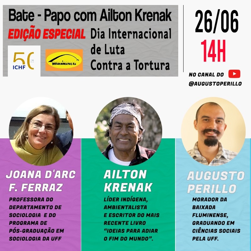 Bate-Papo entre o líder indígena, ambientalista e escritor do mais recente livro “Ideias para adiar o fim do munto”, Ailton Krenak, a Profª. Joana Ferraz, docente do Dep. de Sociologia e Metodologia das Ciências Sociais/UFF, e Augusto Perillo.