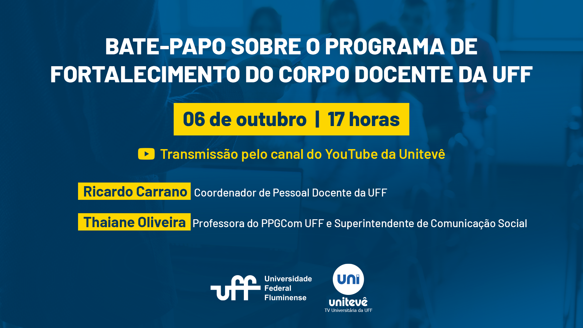 Bate-papo sobre o Programa de Fortalecimento do Corpo Docente da UFF com o professor Ricardo Carrano, Coordenador de Pessoal Docente da UFF, e a professora do PPGCom UFF e Superintendente de Comunicação Social, Thaiane Oliveira.