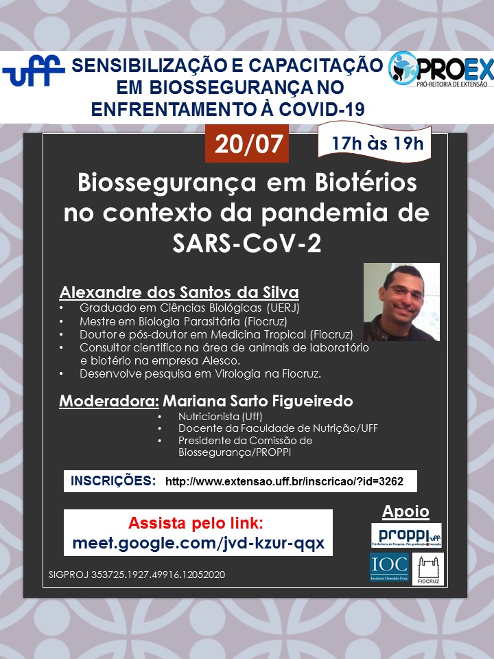 #ProexEmAção divulga em parceria com o programa de extensão Sensibilização e Capacitação no Enfrentamento à COVID -19, coordenado pelo professor Luiz Roberto Leão do Instituto de Biologia – UFF, o evento virtual Biossegurança em Biotérios no Contexto da Pandemia de SARS-CoV-2, no dia 20/07 das 17h às 19h.
