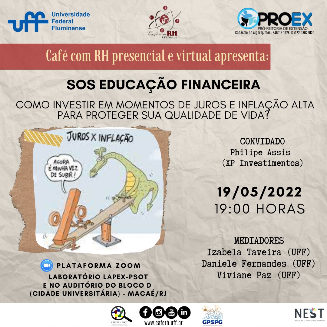 Nosso Próximo SOS – Educação Financeira irá abordar um tema super que tem nos desesperado atualmente. Juros e inflação alta e o caos na nossa vida como um todo. Como lidar com isto? Como podemos minimizar os impactos deste contexto na nossa qualidade de vida? Onde investir? Que despesas desnecessárias podemos eliminar? Menos é mais! Vamos focar nosso consumo naquilo que realmente é importante e que faz sentido para nossas vidas? Será que consumindo de modo mais sustentável a qualidade de vida de toda a coletividade não poderia ser bem melhor? Estas entre outras questões serão o tema desta roda de conversa. Esse evento acontecerá tanto na modalidade online quanto presencial. É necessário se inscrever através do link http://www.extensao.uff.br/inscricao/?curso=5175 para ambas modalidades. E para quem desejar comparecer ao evento presencialmente além de se inscrever no link citado, por favor, envie um email para caferhuffmacaeeventos@gmail.com para realizar sua reserva, uma vez que as vagas no auditório são limitadas.
