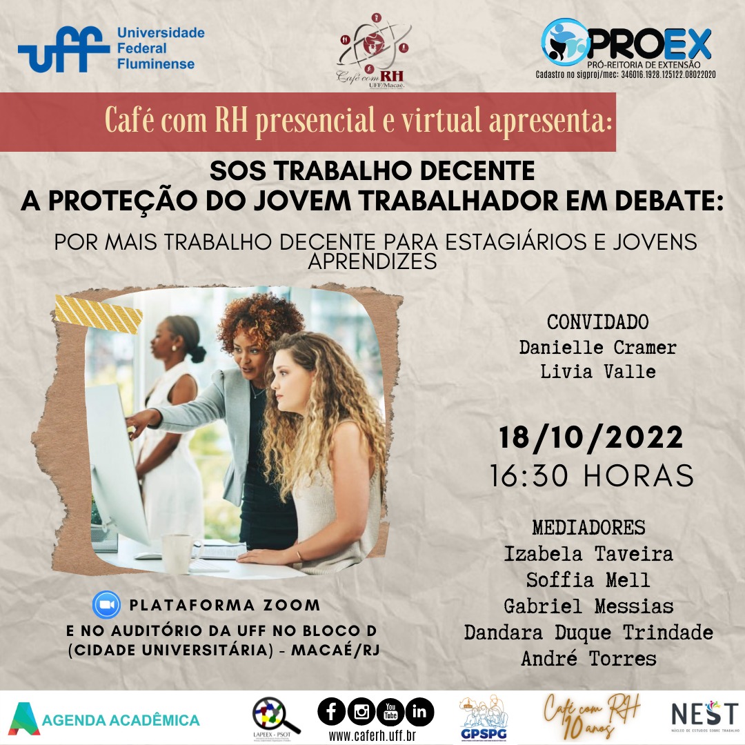 O projeto de extensão Café com RH faz parte do Lappex- psot (Laboratorio de ensino, pesquisa e extensão: Pessoas, subjetividade, organizacoes e trabalho) do departamento de administração da UFF em Macaé. Este laboratório também envolve as atividades do Nest – Nucleo de estudo sobre Trabalho e Ocio e do GPSG – Grupo de pesquisa Gestão com pessoas e Subjetividade na área de petróleo e Gás. Temos como proposito a promoção do trabalho decente ( ODS 8 – Objetivo de desenvolvimento sustentável) da OIT/ONU (agenda sustentável 2030/2050). Conheça nosso projeto www.caferh.uff.br Conheça nosso trabalho: site- http//www.caferh.uff.br Linkedin – https://br.linkedin.com/in/caf%C3%A9-com-rh-uff-maca%C3%A9-a7272b51 ( Divulgação de vagas de emprego no estado do RJ) Instagran – https://www.instagram.com/cafecomrhmacae/ Canal de informação e para tirar duvidas sobre nossos eventos. email :caferhuffmacaeeventos@gmail.com