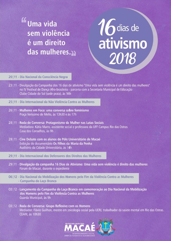 Inicia-se nesta semana os 16 dias de ativismo 2018, com o tema “Uma vida sem violência é um direito das mulheres”. Ao longo destes 16 dias serão realizadas várias atividades na cidade de Macaé, com o objetivo de chamar à reflexão sobre violência de gênero. O evento é promovido pelo Centro Especializado de Atendimento à Mulher (CEAM), da Secretaria de Desenvolvimento Social, Direitos Humanos e Acessibilidade.