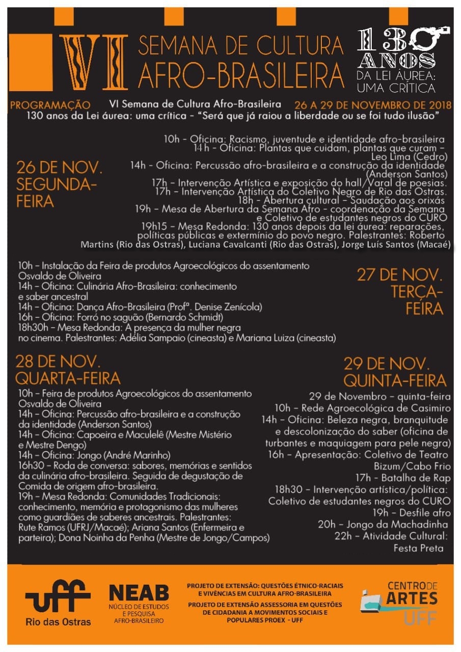 Oficinas (dança, capoeira, forró, percussão, confecção de turbantes e maquiagem para pele negra), mesas-redondas, rodas de conversa, intervenções culturais, exposições, batalha de Rap, atividade cultural : festa preta, feira de produtos agroecológicos do assentamento Osvaldo Oliveira, dentre outras atividades serão realizadas na 6ª Semana de Cultura Afro- Brasileira” 130 anos da lei áurea: uma crítica- “será que já raiou a liberdade ou foi tudo ilusão’, do dia 26 a 29 de novembro, no Campus UFF de Rio das Ostras (Curo).
