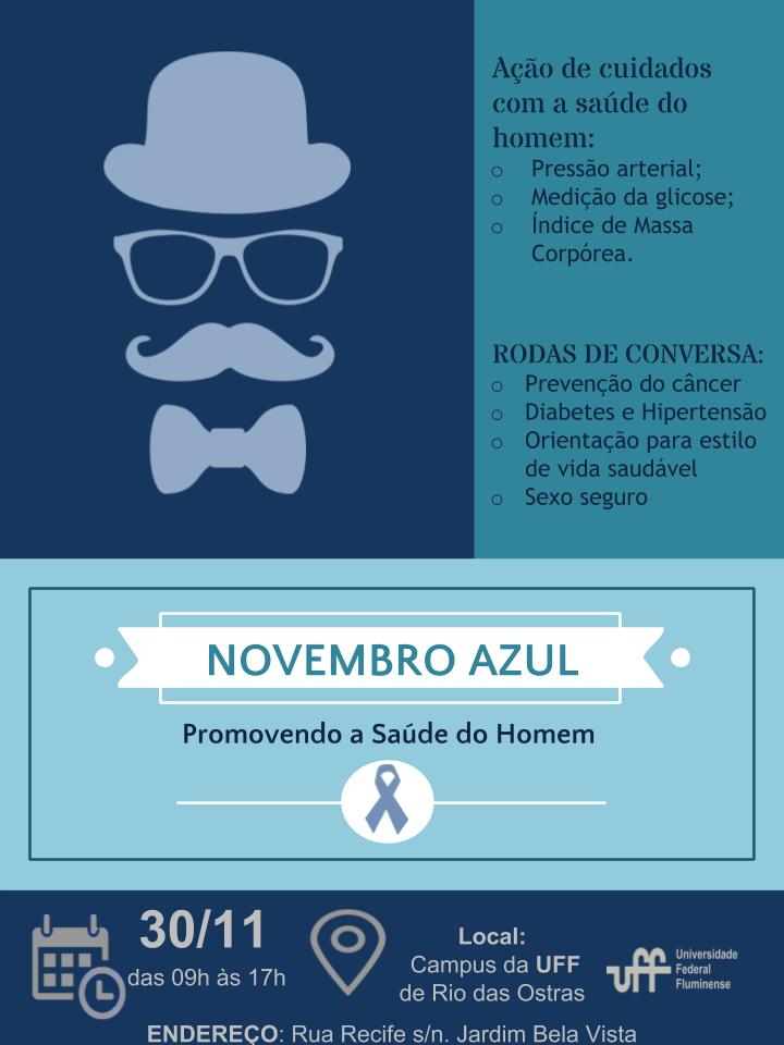 Se você é um homem que se preocupa com a sua saúde, o Campus UFF de Rio das Ostras (Curo) através do Curso de Enfermagem estará promovendo no dia 30 de novembro (sexta-feira), das 9h às 17h, o dia “D” do novembro azul com várias atividades voltadas para a saúde masculina.