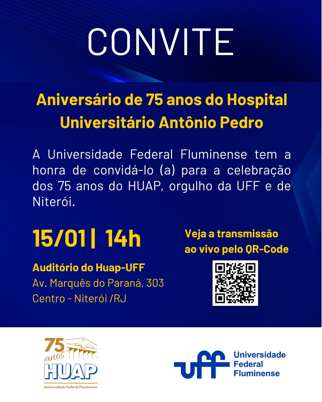A Universidade Federal Fluminense tem a honra de convidá-lo(a) para a cerimônia solene de 75 anos do Hospital Universitário Antônio Pedro. Marcado por grandes conquistas e focado na assistência, no ensino, na pesquisa e na inovação, o hospital é inteiramente integrado ao Sistema Único de Saúde e possui papel estratégico na Região Metropolitana II, na cidade de Niterói e no estado do Rio de Janeiro.