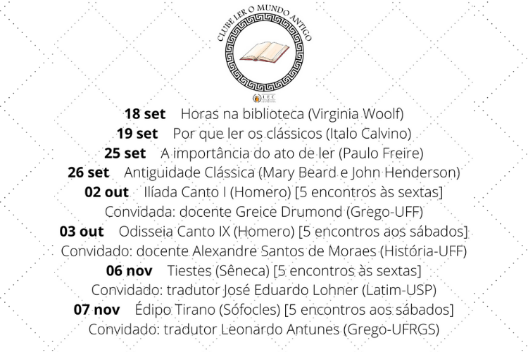 O Clube Ler o Mundo Antigo, ligado ao Laboratório de Estudos Clássicos da UFF (LEC-UFF), foi criado para apoiar as atividades acadêmicas não presenciais, mas é aberto a todos que queiram fazer da leitura uma prática saudável para mente e espírito. Ler em grupo é melhor!