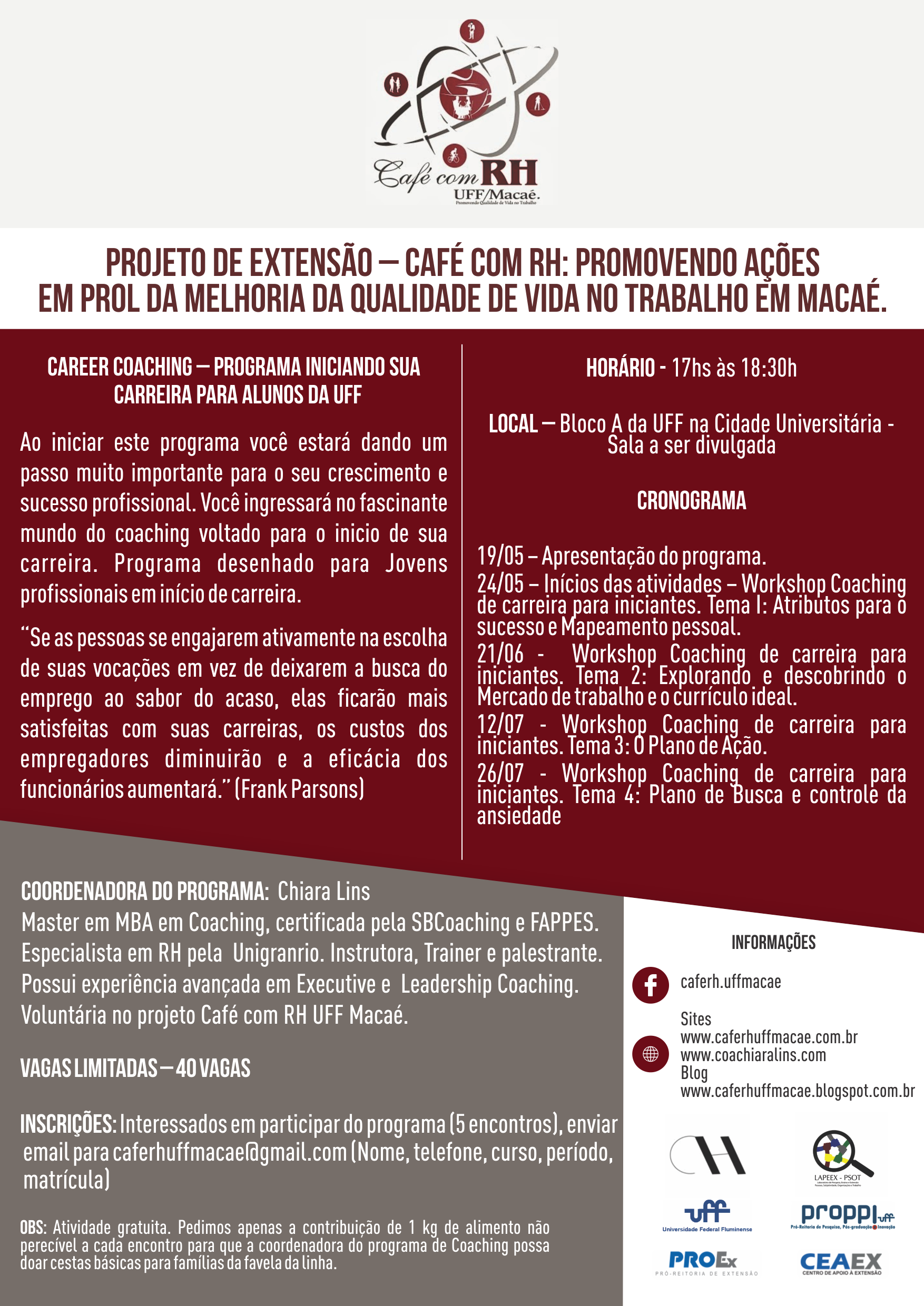 Coordenadora do programa:Chiara Lins. Master em MBA em Coaching, certificada pela SBCoaching e FAPPES . Especialista em RH pela Unigranrio. Instrutora , Trainer e palestrante. Possui experiência avançada em Executive e Leadership Coaching. Voluntária no projeto Café com RH UFF Macaé.