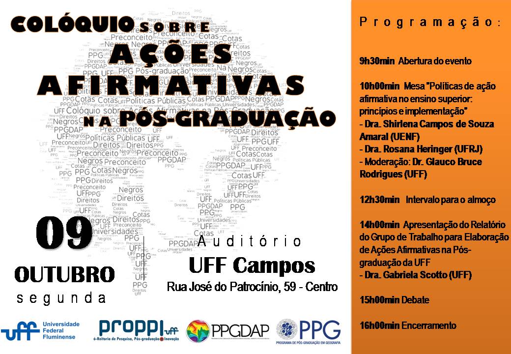 Colóquio sobre "Ações afirmativas na Pós-Graduação"No dia 09 de outubro acontece o colóquio sobre “Ações afirmativas na Pós-Graduação”, evento promovido e organizado pelos programas de pós-graduação strictu sensu da UFF Campos. Participe! ambiente, Desenvolvimento Regional, Políticas Públicas, Pós-graduação Colóquio