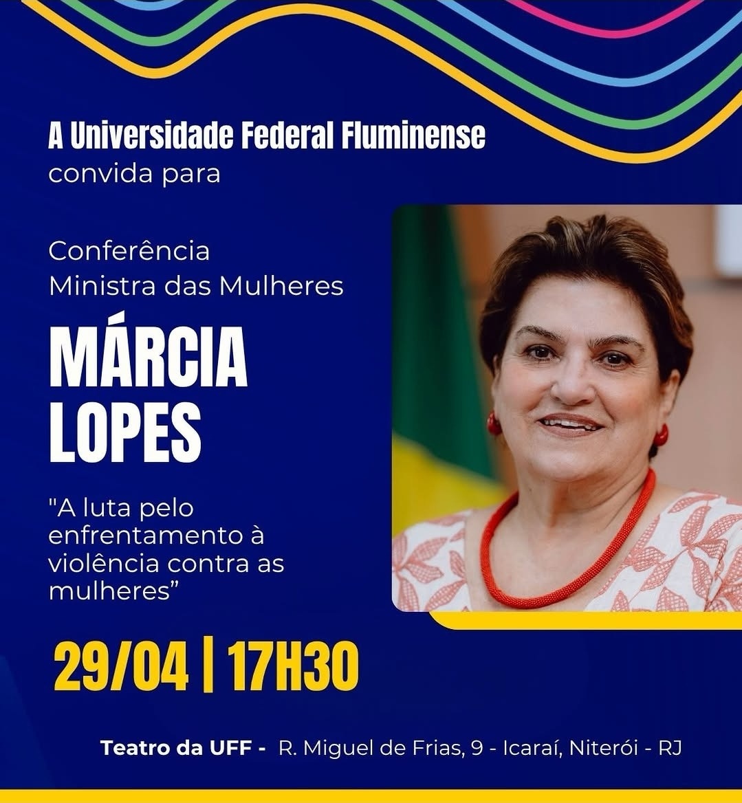 A Universidade Federal Fluminense promove, no dia 29 de abril, às 17h30, a conferência “Todos por todas: a luta pelo enfrentamento à violência contra as mulheres”, com a presença da Ministra das Mulheres, Márcia Lopes. O encontro convida a comunidade acadêmica a refletir sobre estratégias de enfrentamento à violência de gênero e o fortalecimento de políticas públicas voltadas ao tema.