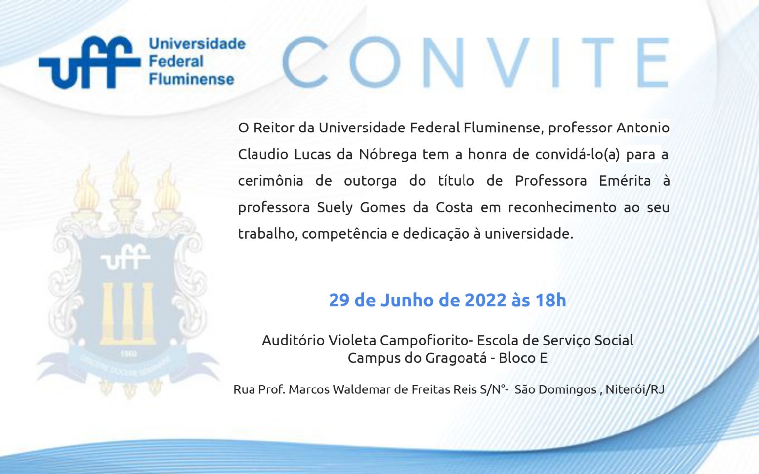 O Reitor da Universidade Federal Fluminense, professor Antonio Claudio Lucas da Nóbrega, tem a honra de convidá-lo(a) para a cerimônia de outorga do título de Professora Emérita à professora Suely Gomes da Costa em reconhecimento ao seu trabalho, competência e dedicação à universidade.