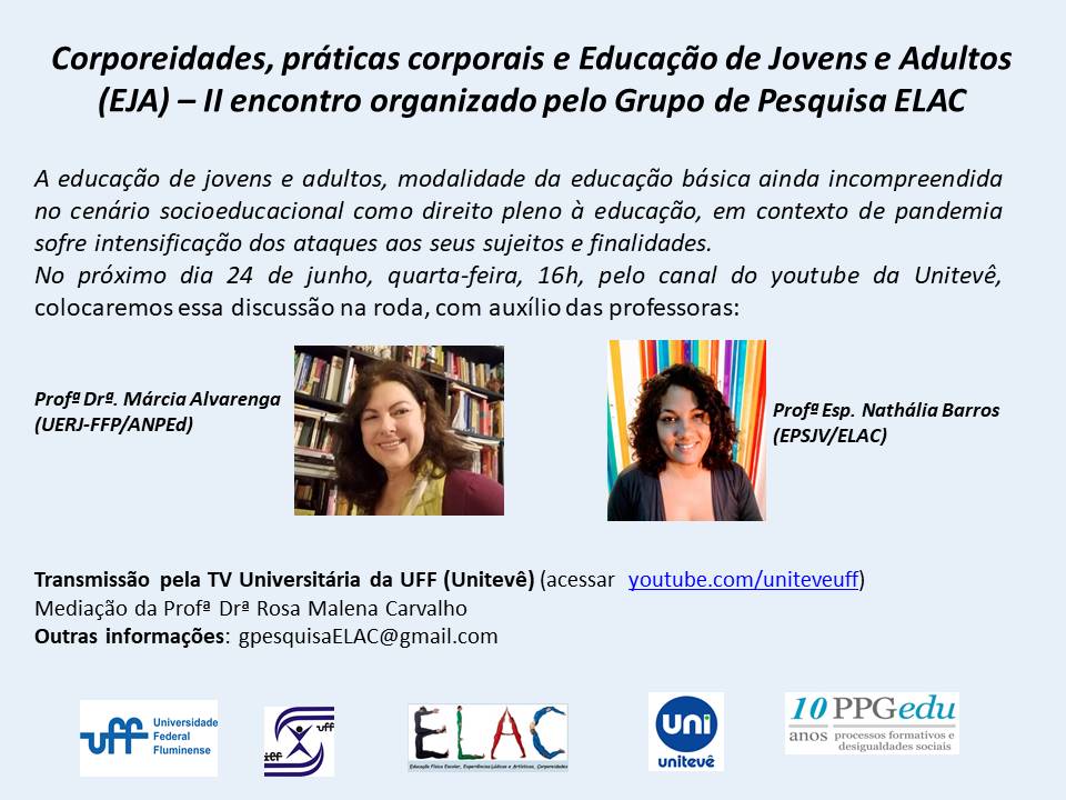 A educação de jovens e adultos, modalidade da educação básica ainda incompreendida no cenário socioeducacional como direito pleno à educação, em contexto de pandemia sofre intensificação dos ataques aos seus sujeitos e finalidades. O objetivo da II live organizada pelo Grupo de Pesquisa ELAC (IEF-UFF), a ser realizada em 24 de junho, uma quarta-feira, entre 16h e 18h, pelo canal do youtube da Unitevê, é interrogar essa situação; mencionar indicativos relacionados ao acesso e à permanência das pessoas jovens e adultas na escolarização e; debatermos as condições necessárias para processos formativos que priorizam a proteção e dignidade da vida. Nesse dia, contaremos com a presença da Profª Drª. Márcia Alvarenga (UERJ-FFP/ANPEd), da Profª Esp. Nathália Barros (EJA-Manguinhos/ELAC) e com a mediação da Profª Drª Rosa Malena Carvalho (IEF/UFF e PPGEDU-PFDS/UERJ-SG).
