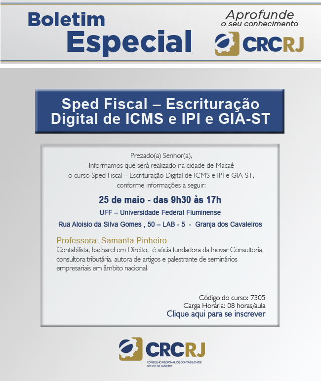 Com o objetivo de trazer maiores informações para alunos, professores e profissionais ligados à área da contabilidade no município, o CRC – Conselho Regional de Contabilidade apresenta o curso : SPED Fiscal-Escrituração Fiscal de ICMS e IPI e GIA-ST,  que será ministrado pela professora Samantha Pinheiro, contabilista,  bacharel em Direito, consultora tributária, autora de artigos e palestrante em seminários de nível nacional.