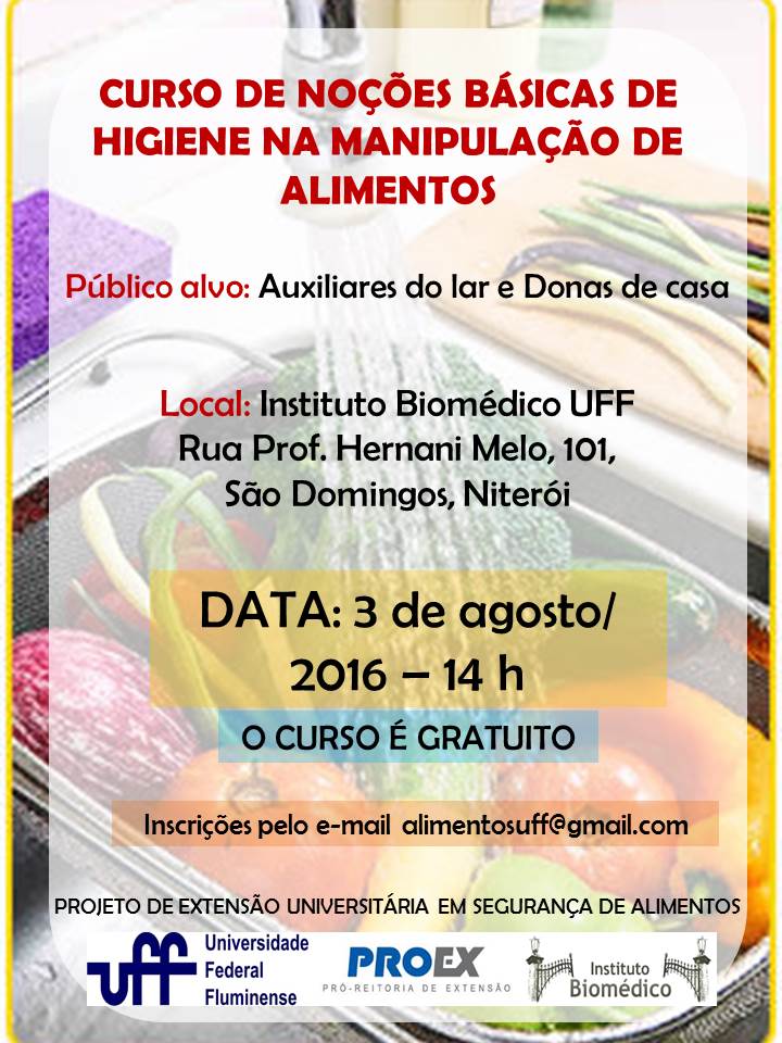 Será realizado no próximo dia 03 de agosto, às 14h, o curso de Noções Básicas de Higiene na Manipulação dos Alimentos, no Instituto Biomédico da UFF. O curso faz parte do Programa de Extensão Universitária em Segurança de Alimentos e será oferecido para os manipuladores de alimentos que atuam nas residências, tais como donas de casa e empregadas domésticas.