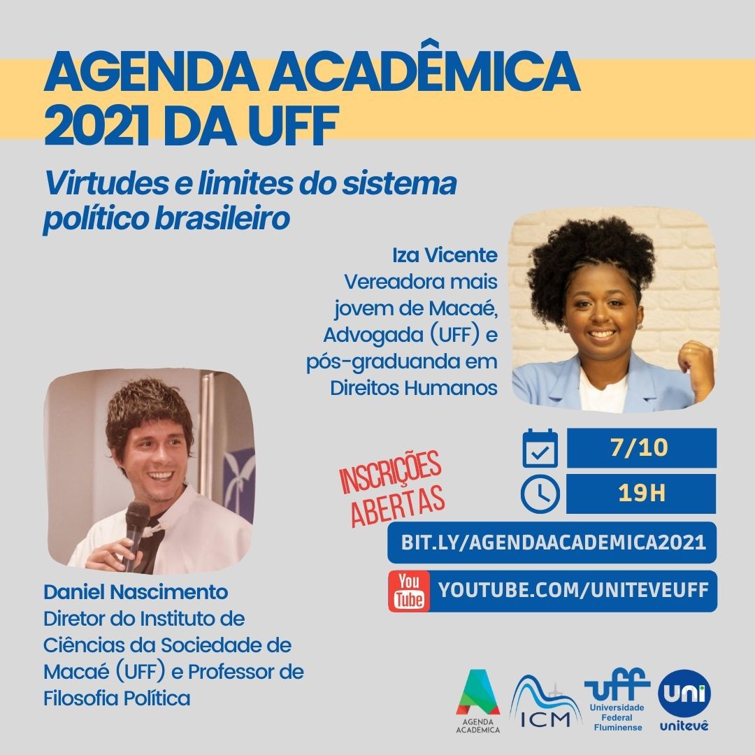 O evento, integrante da Agenda Acadêmica 2021, será promovido pelo Instituto de Ciências da Sociedade (UFF – MACAÉ) e contará com a participação do seu diretor, o professor de Filosofia Política, Daniel Nascimento, e com Iza Vicente, ex- aluna da UFF e a vereadora mais jovem de Macaé.
