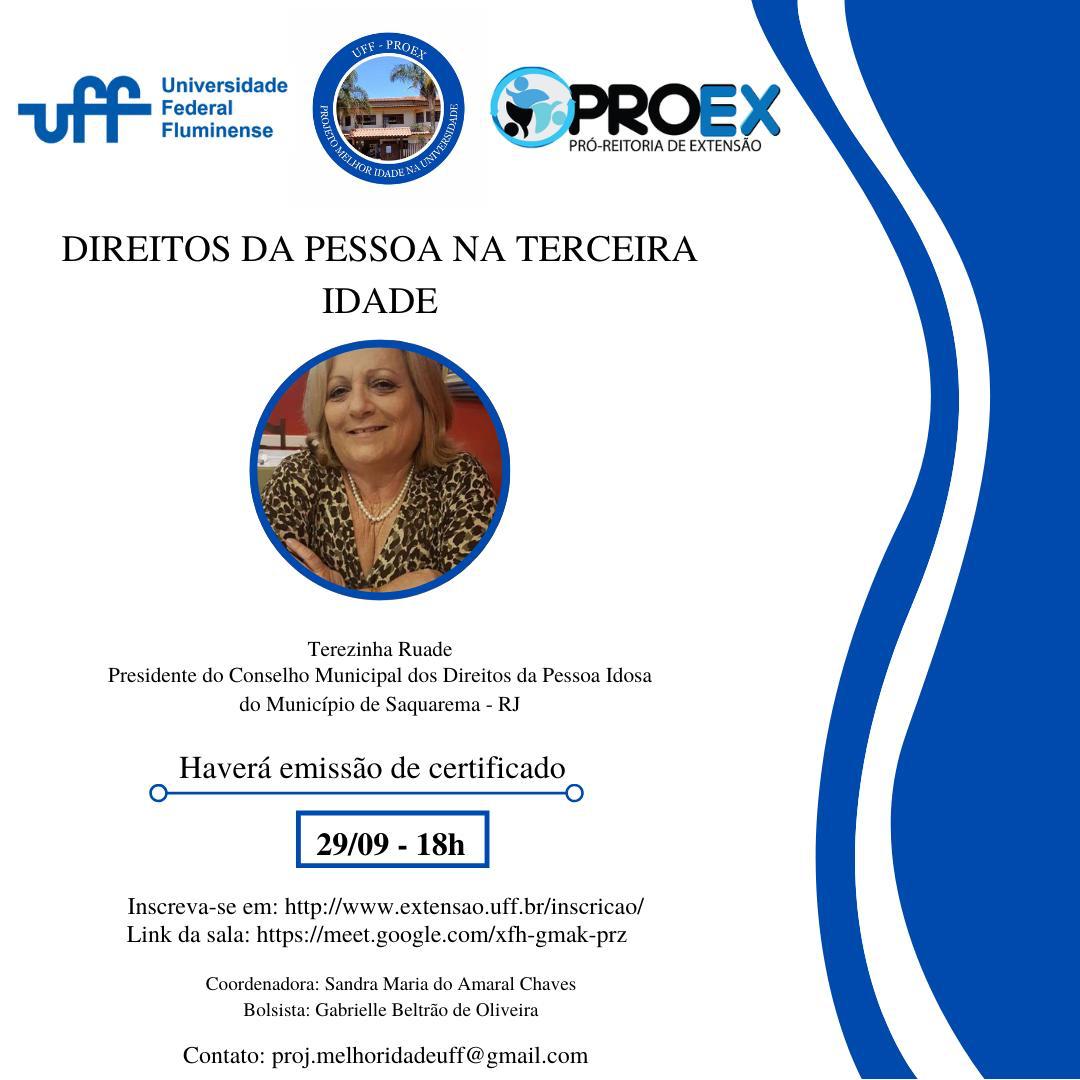 O projeto de extensão Melhor Idade UFF promove a palestra “Direitos da Pessoa na Terceira Idade” com a presidente do Conselho Municipal dos Direitos da Pessoa Idosa do município de Saquarema, Terezinha Ruade. Haverá emissão de certificado. Inscreva-se em: http://www.extensao.uff.br/inscricao