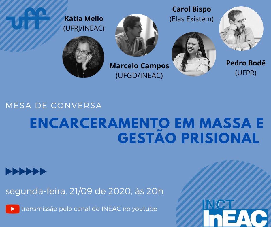 A mesa de conversa do dia 21.09 traz Kátia Mello (UFRJ/InEAC), Marcelo Campos (UFGD/InEAC), Carol Bispo (Elas Existem) e Pedro Bodê (UFPR) para falar sobre o tema “Encarceramento em massa e gestão prisional”.
