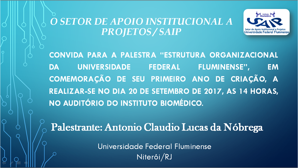 O Setor de Apoio Institucional a Projetos/SAIP convida para a palestra “Estrutura Organizacional da Universidade Federal Fluminense”, em comemoração de seu primeiro ano de criação, a realizar-se no dia 20 de setembro de 2017, as 14 horas, no auditório do Instituto Biomédico.