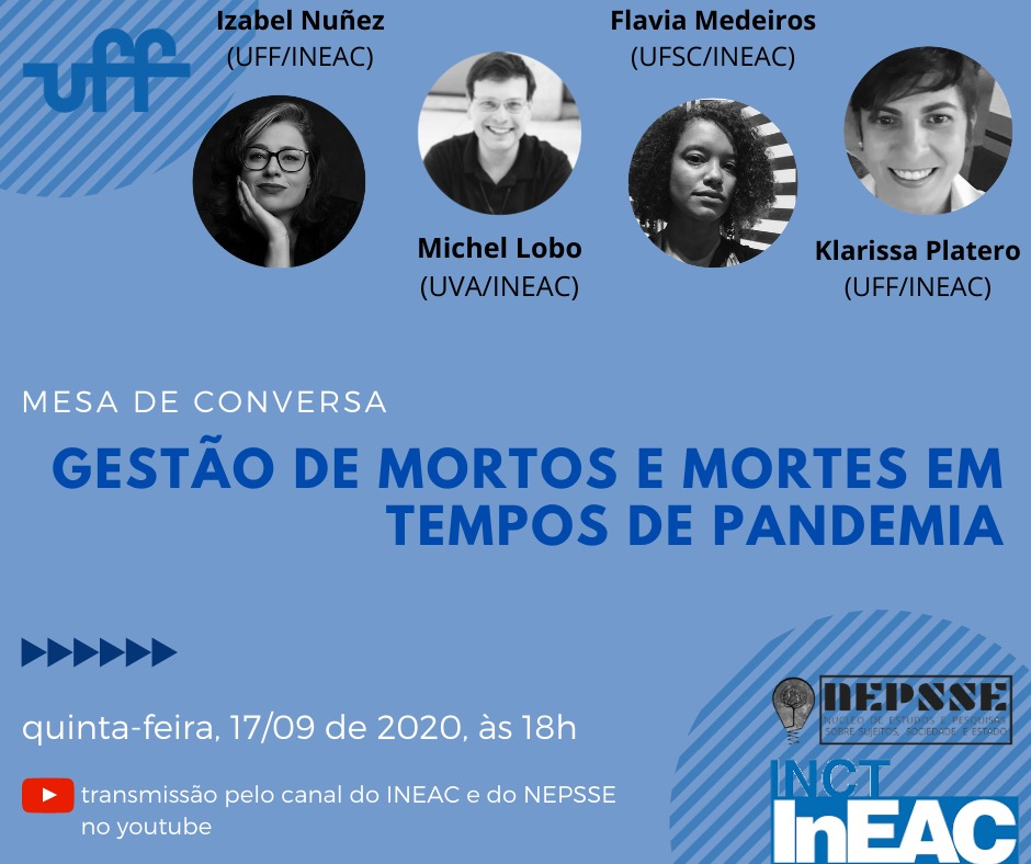 Nesta quinta-feira, 17.09, às 18h, receberemos Izabel Nuñez (UFF/InEAC), Michel Lobo (UVA/InEAC), Flavia Medeiros (UFSC/InEAC) e Klarissa Platero (UFF/InEAC) para falar sobre o tema “Gestão de mortos e mortes em tempos de pandemia”.