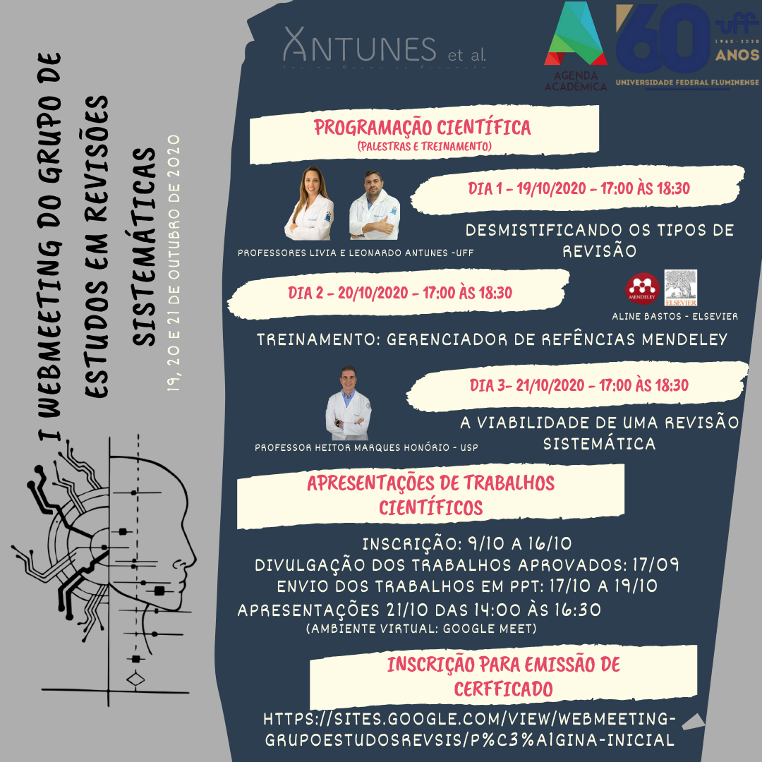 Entre os dias 19 e 21 de outubro, ocorre o I Webmeeting do Grupo de estudos em revisões sistemáticas. O evento gratuito é parte da Agenda Acadêmica da Universidade Federal Fluminense (UFF) para a Semana Nacional de Ciência e Tecnologia 2020. Durante o encontro, estão previstos um treinamento para uso de gerenciador de referências, duas palestras e até apresentação de trabalhos científicos. Ao final, há emissão de certificados para os participantes.