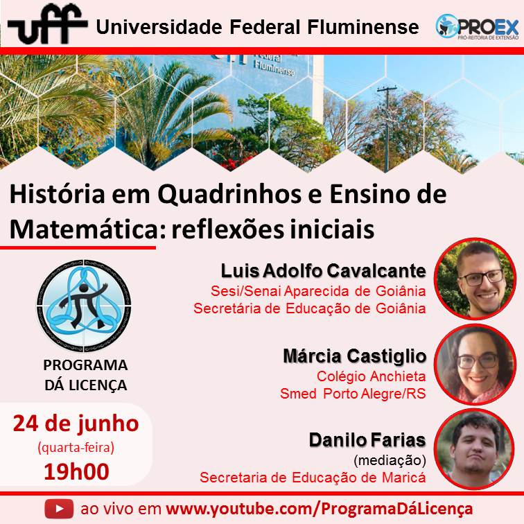 #ProexEmAção divulga o evento virtual Histórias em Quadrinhos Ensino de Matemática: reflexões iniciais do programa de extensão Dá Licença, no dia 24/06 às 19h. Apesar do interesse de muitos professores, o volume de trabalhos sobre HQ e Ensino de Matemática ainda é pequeno se comparado às outras disciplinas escolares. Atentos a esse interesse, o grupo HQEM – História em Quadrinhos no Ensino de Matemática e o projeto Eventos em Educação Matemática, ambos vinculados ao Programa Dá Licença, promoverão uma conversa entre professores de Matemática que se debruçaram sobre essa relação. Essa será uma conversa sobre sentidos, significados e potenciais que a nona arte detém e que podem impactar a nossa prática. Uma oportunidade para pensar a mídia dos quadrinhos enquanto ferramenta pedagógica para a sala de aula de Matemática.