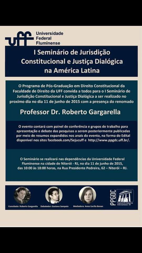 O Programa de Pós-Graduação em Direito Constitucional da Faculdade de Direito da UFF convida a todos para o I Seminário de Jurisdição Constitucional e Justiça Dialógica na América Latina a ser realizado no dia 11 de junho de 2015, das 10 às 18 horas, na rua Presidente Pedreira, 62 – Niterói – RJ.