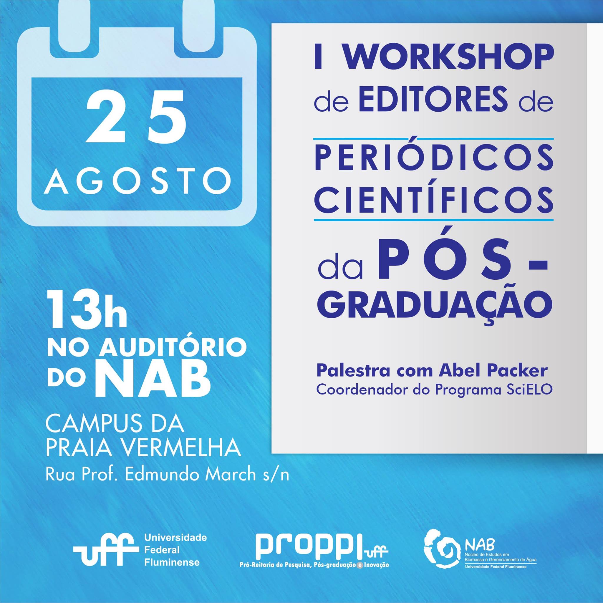 A Pró-reitoria de Pesquisa, Pós-graduação e Inovação, através do Fórum de Editores de Periódicos Científicos, convida a todos os editores de revistas científicas da UFF – Universidade Federal Fluminense e demais interessados a participar do I Workshop de editores de periódicos científicos da UFF, a ser realizado no dia 25 de agosto de 2017, às 13h.