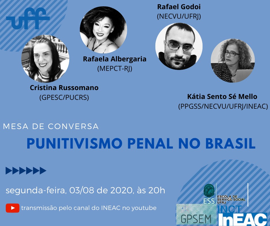 A Mesa de Conversa desta segunda-feira, 03.08, traz como convidados Kátia Sento Sé Mello (PPGSS/NECVU/UFRJ/INEAC), Rafael Godoi (NECVU/UFRJ), Rafaela Albergaria (MEPCT-RJ) e Cristina Russomano (GPESC/PUCRS) para discutir o tema “Punitivismo penal no Brasil”.