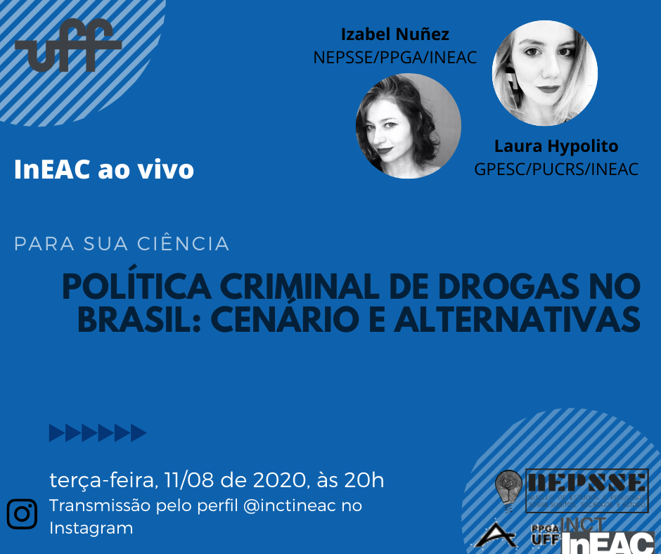 Nesta segunda-feira, 11.08, às 20h, Izabel Nuñez (NEPSSE/PPGA/INEAC) conversa com Laura Hypolito (GPESC/PUCRS/INEAC) sobre o tema “Política criminal de drogas no Brasil: cenário e alternativas”.