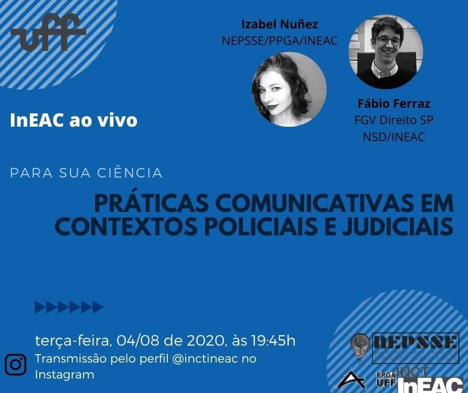 Nesta terça-feira, às 20h, o ‘para sua ciência’ traz Izabel Nuñez (NEPSSE/PPGA/INEAC) e Fábio Ferraz (NSD/INEAC) para conversar sobre o tema ‘Práticas comunicativas em contextos policiais e judiciais’.