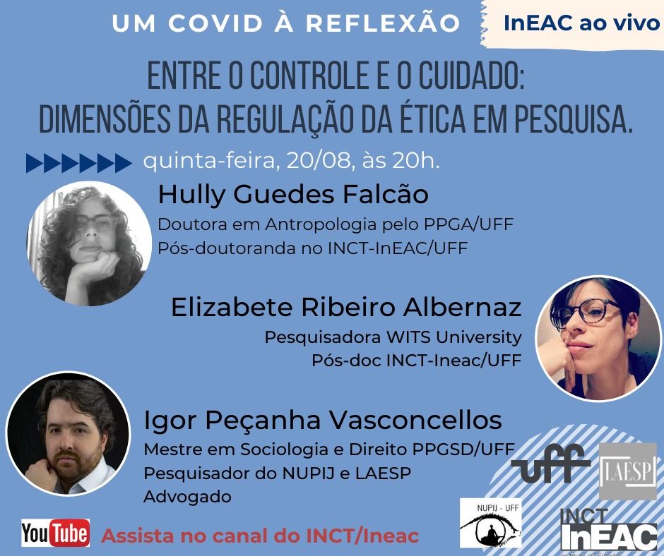 O programa dessa semana recebe Hully Guedes Falcão (Doutora em Antropologia pelo PPGA/UFF e Pós-doutoranda no INCT-InEAC/UFF) para conversar com Elizabete Albernaz (Pesquisadora WITS University e Pós-doc do INCT-InEAC/UFF) e Igor Vasconcellos (Mestre em Sociologia e Direito PPGSD/UFF, Pesquisador do NUPIJ e LAESP e Advogado) sobre o tema “Entre o controle e o cuidado: dimensões da regulação da ética em pesquisa”.