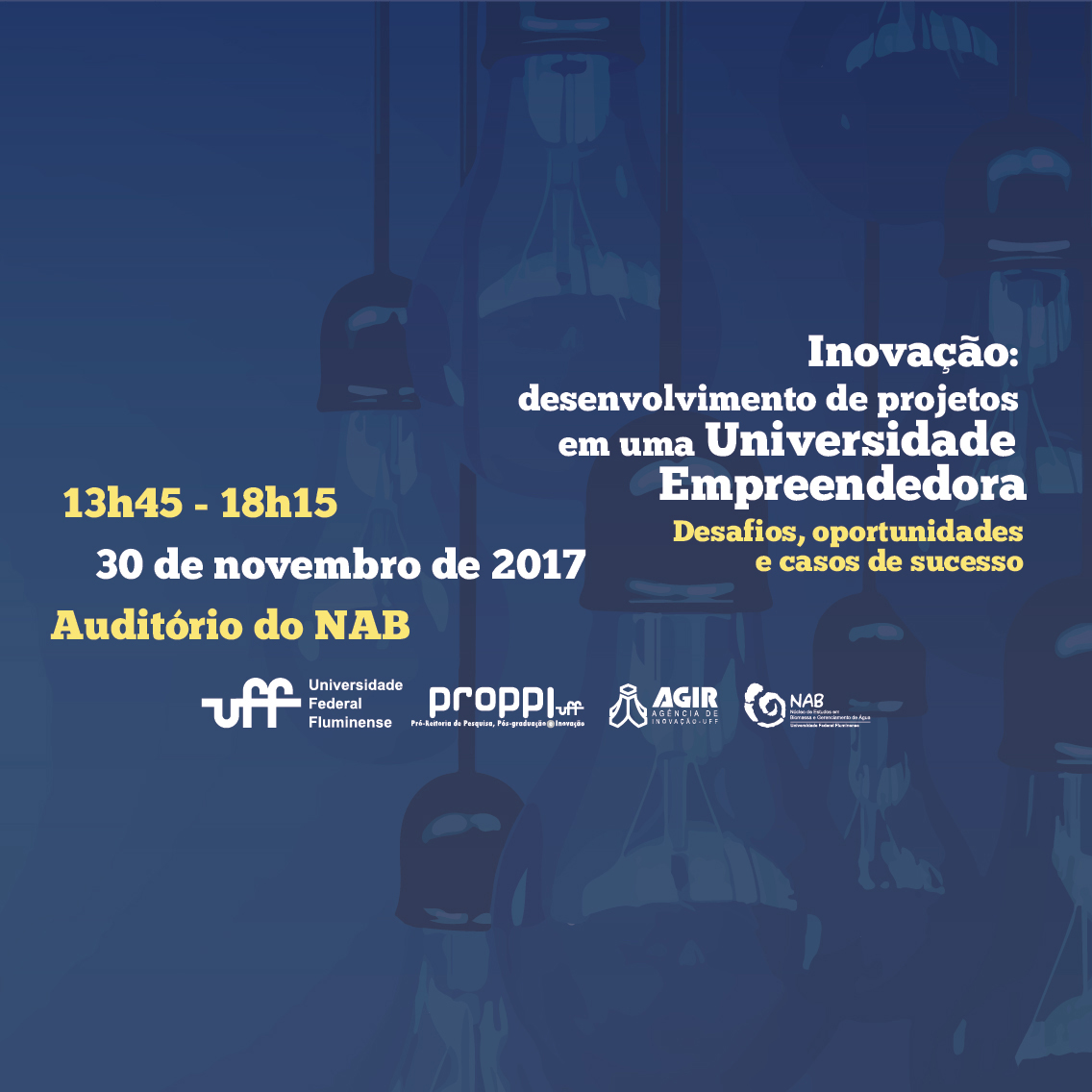 A Universidade Federal Fluminense, por meio da Pró-Reitoria de Pesquisa, Pós-Graduação e Inovação e da Agência de Inovação – AGIR, convida para o seminário Inovação: desenvolvimento de projetos em uma universidade empreendedora, a ser realizado no Auditório do Núcleo de Estudos em Biomassa e Gerenciamento de Águas, no Campus da Praia Vermelha.